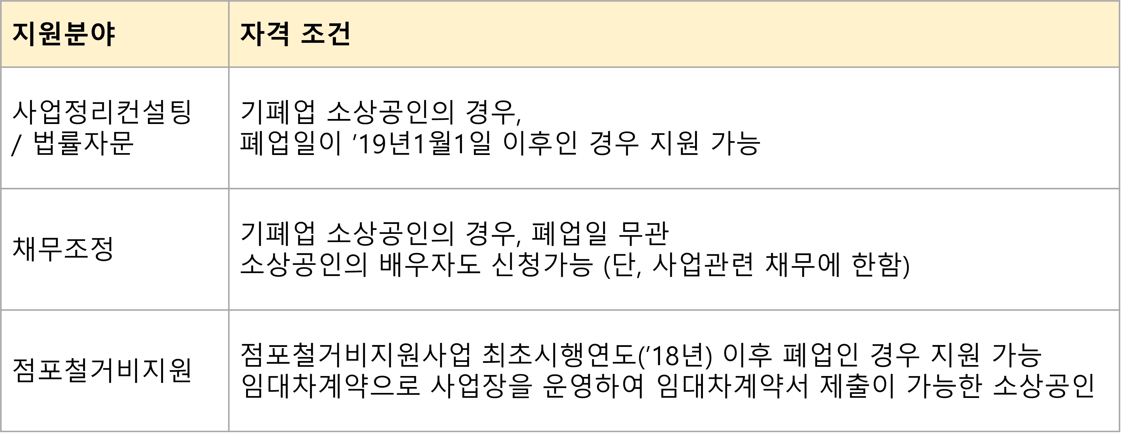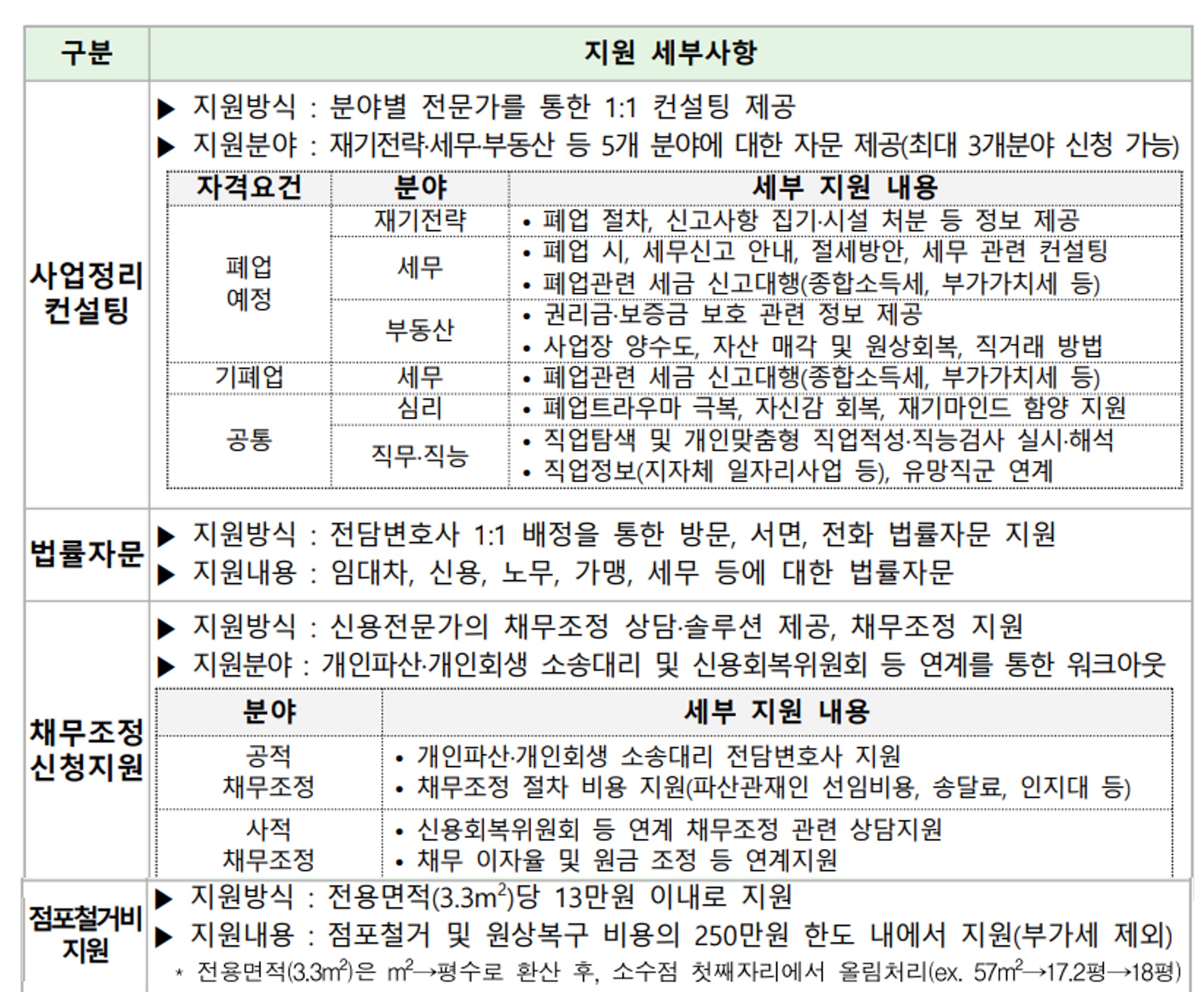 사업정리 컨설팅, 법률자문, 채무조정신청지원, 철거비지원 4가지 항목으로 다양하게 지원합니다.