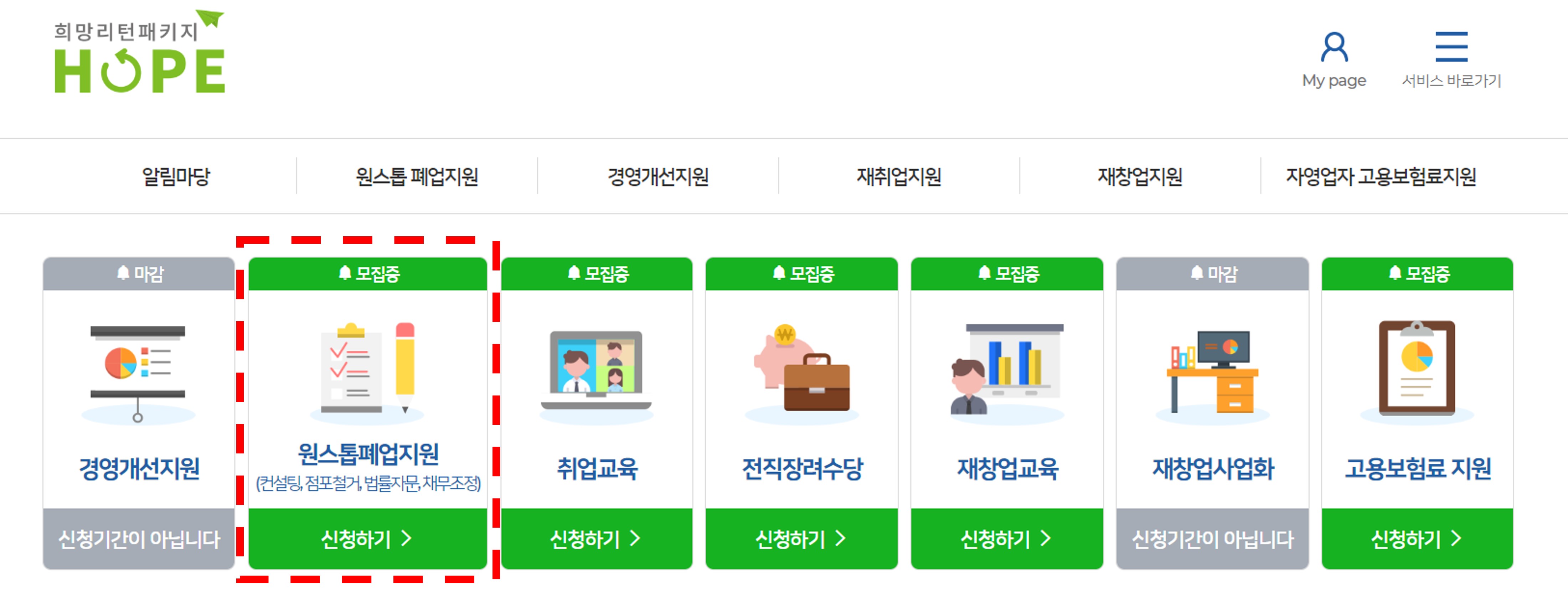 희망리턴 패키지 홈페이지(원스톱 폐업지원 선택)에서 신청