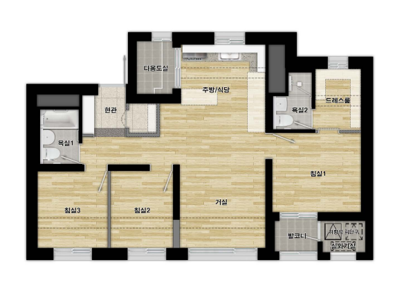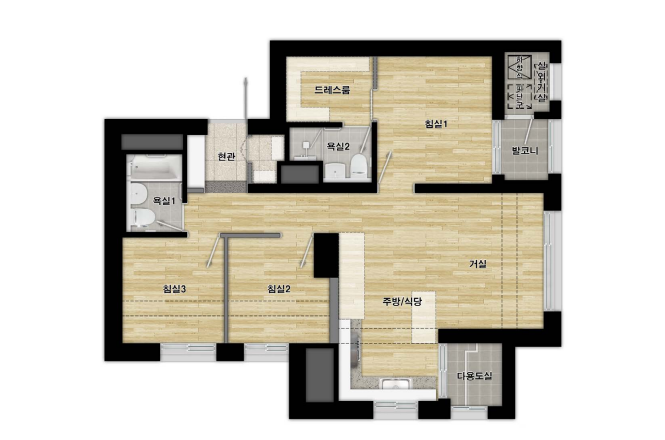 모두 주방/식당, 거실, 침실이 3개, 욕실이 2개로, 다양한 세대 구성원들을 만족시킬 수 있는 평면입니다.