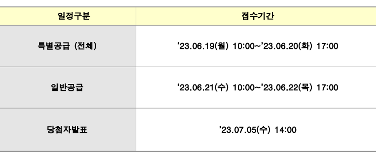 - 서울시 거주자 미달 시, 잔여 물량은 기타 지역(수도권) 거주자에게 공급합니다.