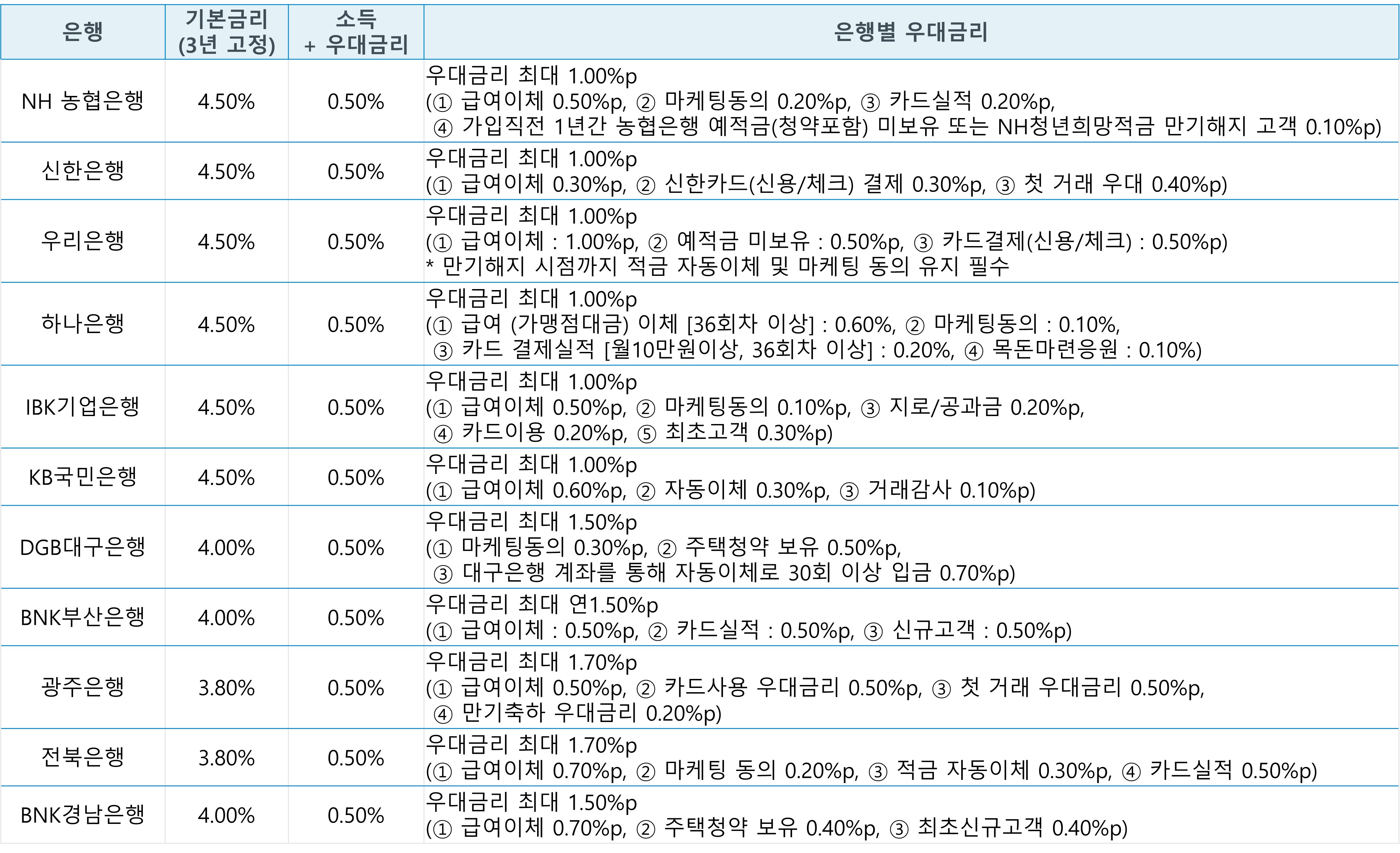 2) 신청 시점 및 가입 후 1년을 주기로 심사한 개인소득금액의 소득요건 충족 횟수에 따라 우대금리 적용됩니다.