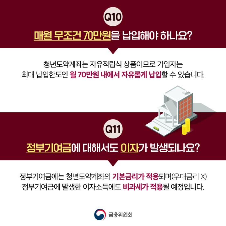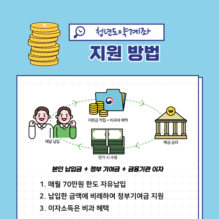 청년들의 중장기 자산형성을 위해 지원하는 청년도약계좌에 대해서 알아보아요!! 청년도약계좌란 청년도약계좌란 현 정부의 국정과제로, 매달 일정금액을 5년간 납입하면, 정부 지원금과 은행