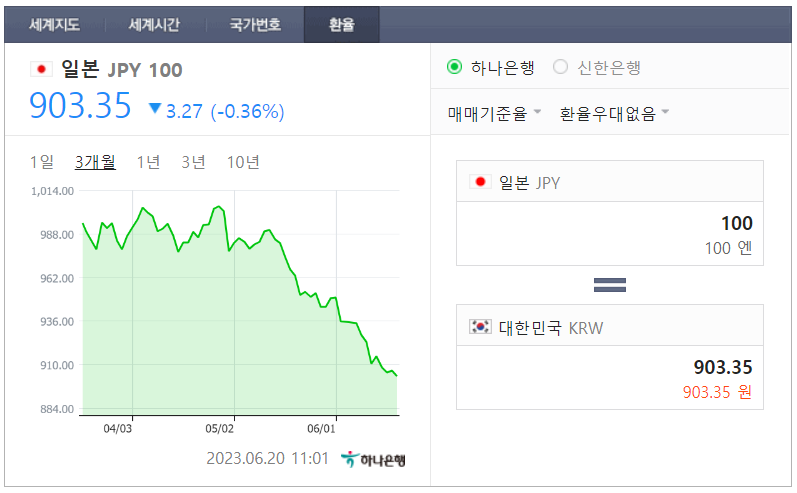 엔화는 오늘 6/20일 기준으로 900원 대의 마지막 자락을 붙잡고 있습니다.