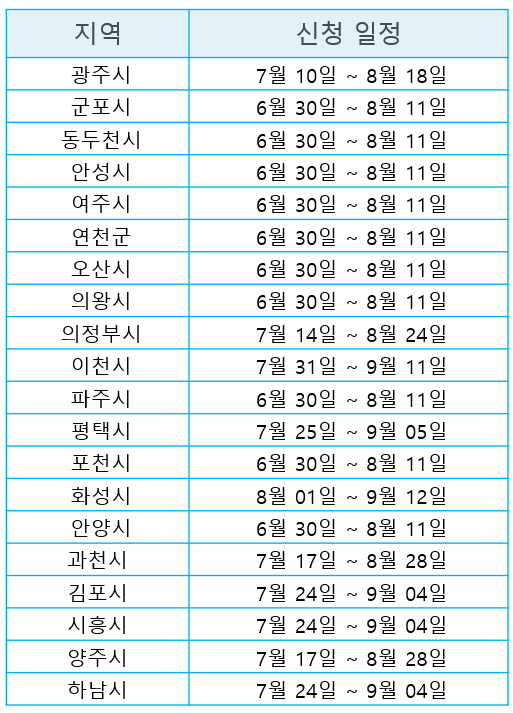 - 안양시, 파주시, 군포시, 오산시, 안성시, 의왕시, 포천시, 여주시, 동두천시, 연천군 : 6월 30일 ~ 8월 11일