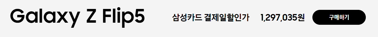 Z플립5는 256GB 기준, 정가 1,399,200원, 삼성닷컴에서 결제 시 1,297,035원에 구매가능합니다.