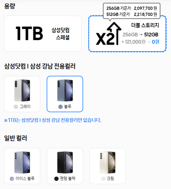 또한, Z폴드5의 경우 1tb용량은 삼성닷컴에서만 구매가 가능합니다.