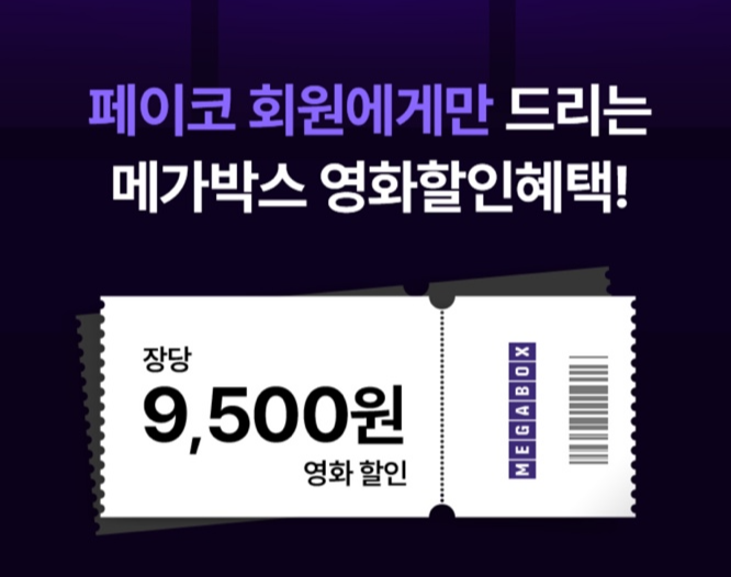 메가박스 할인받기 : 장당 9,500원 (페이코)