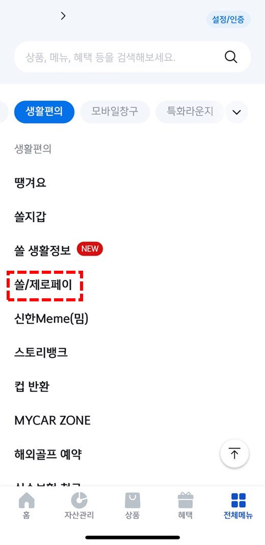신한sol 어플을 켜고, "전체메뉴 > 생활편의 > 솔/제로페이"를 선택합니다.