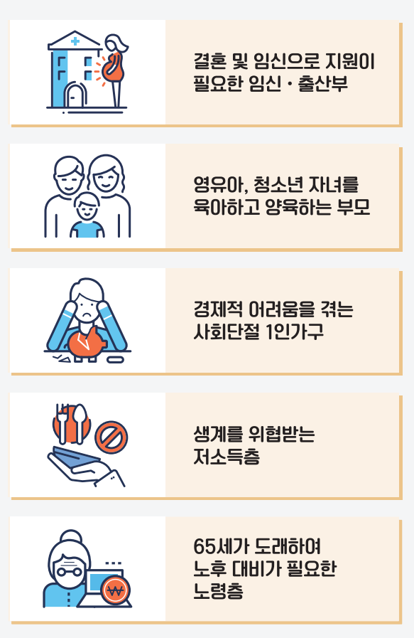 복지멤버십은 결혼과 임신으로 지원이 필요한 가정, 육아에 어려움이 있는 가정, 경제적 어려움이 있는 1인가구, 생계가 어려운 저소득층, 노후 대비가 필요한 노령층 등 복지가 필요하신 모든 분들을 대상으로 하고 있습니다.