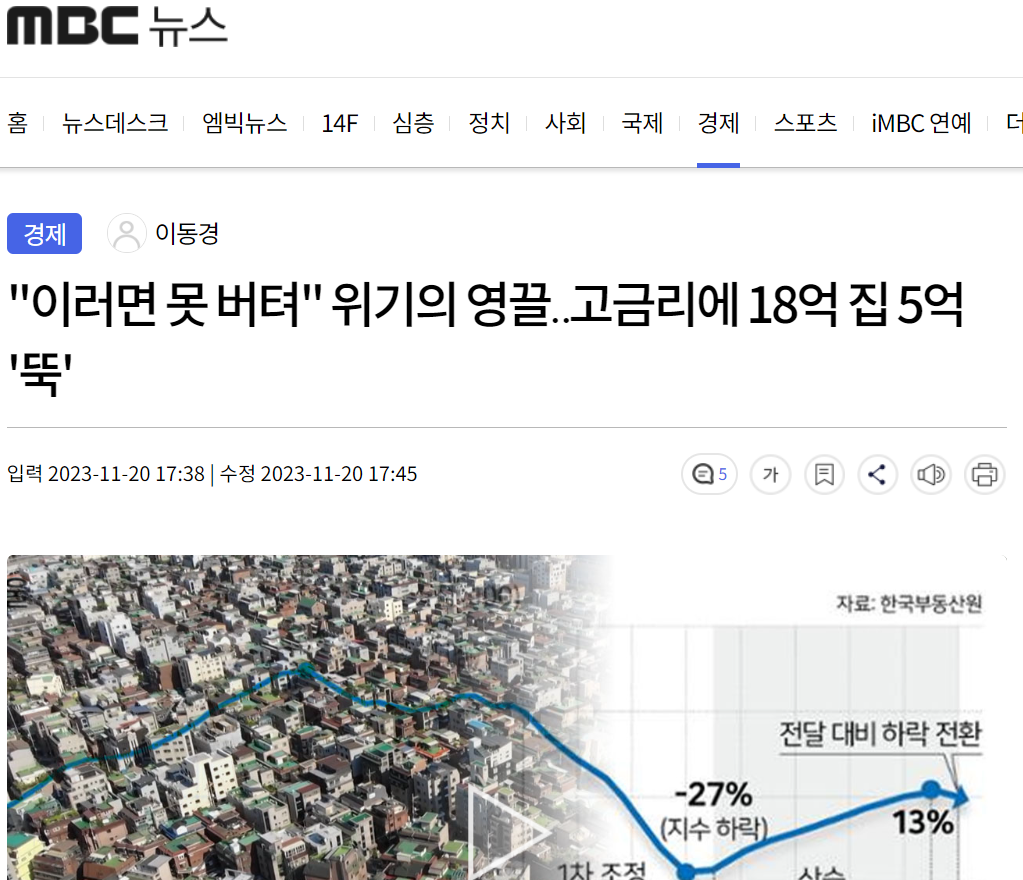 버티지 못하는 영끌족들로 인해 집값이 계속해서 떨어지고 있다는 뉴스가 계속 나오고 있습니다.