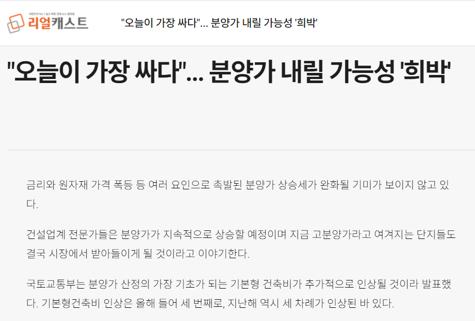 재료비, 인건비의 상승으로 인해 공사금액이 늘어났고, 분양가는 계속해서 오를 수밖에 없다는 논리입니다.