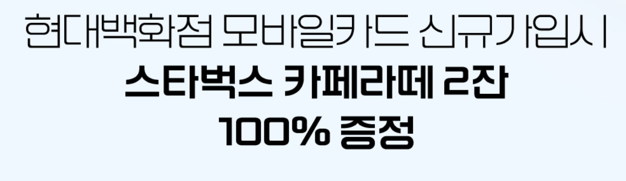 현대백화점 모바일카드 가입만 하면 스타벅스 라떼 2잔이 100% 증정되고, 백화점 무료주차권이 매달 지급됩니다.