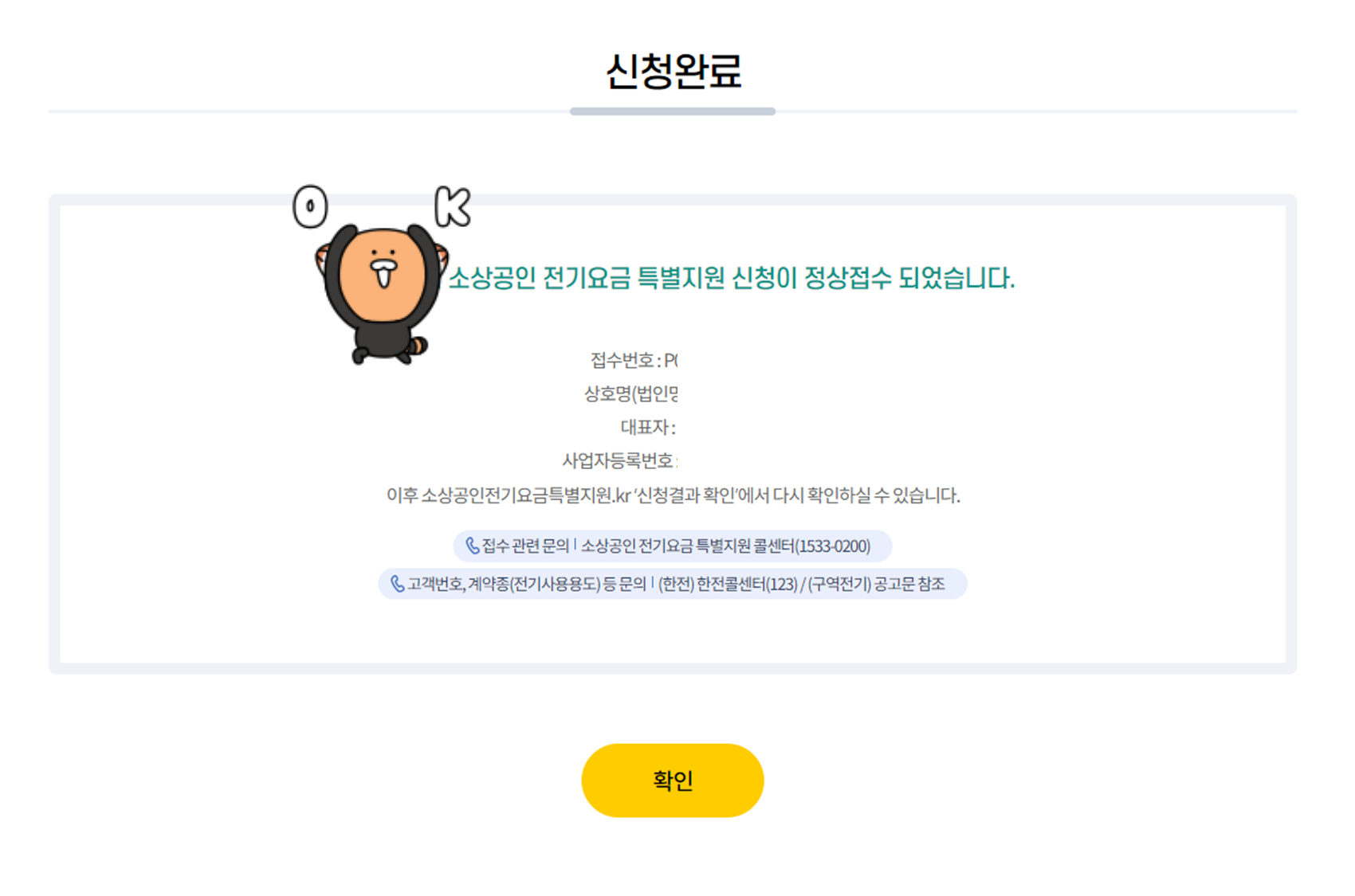 신청결과는 "소상공인전기요금특별지원.kr"에서 다시 확인하실 수 있습니다.