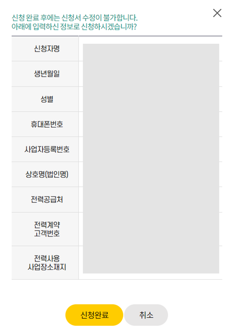 내용을 확인하시고 신청완료버튼을 선택하시면,