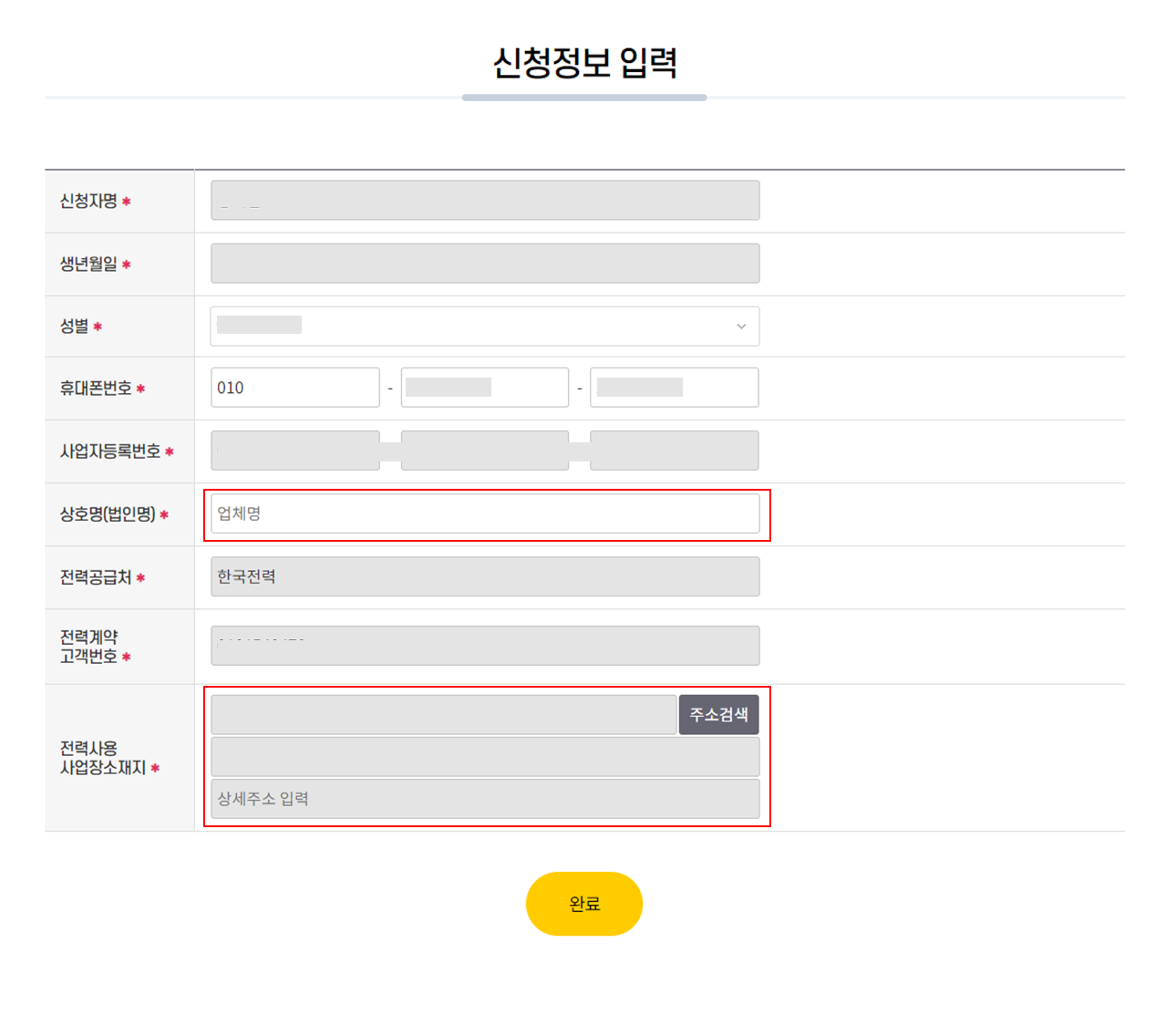 신청자명, 생년월일 부터 고객번호까지는 자동으로 입력되고,