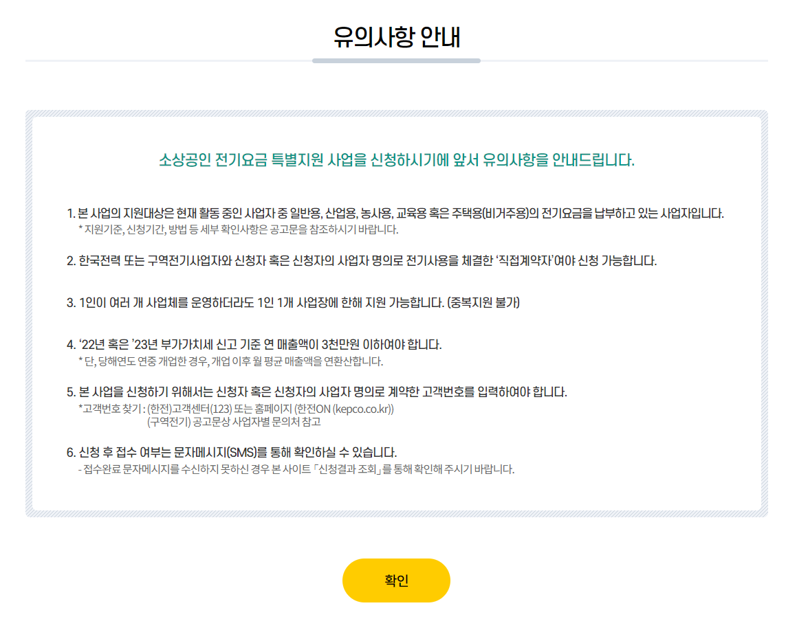 소상공인 전기요금 특별지원 처리 유의사항에 대한 동의를 하면,